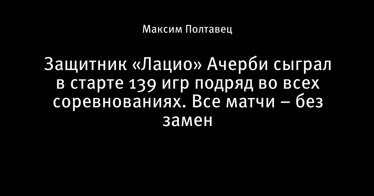 Защитник «Лацио» Ачерби сыграл в старте 139 игр подряд во всех соревнованиях. Все матчи – без замен