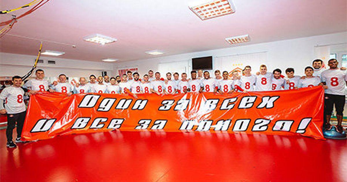 Основной состав команды сфотографировался в футболках с цифрой 8 и баннером «Один за всех и все за одного!».