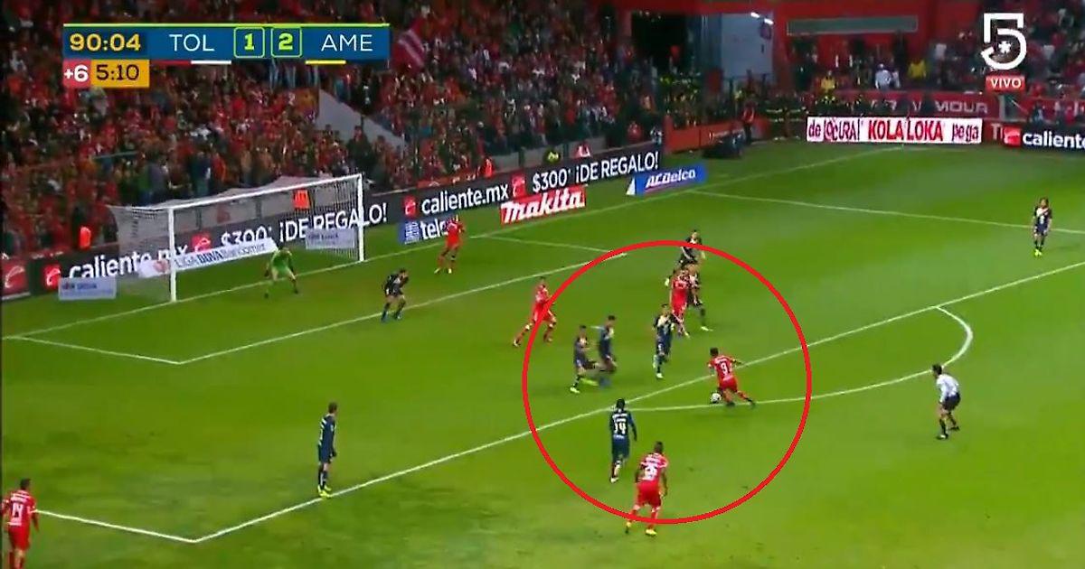 Алексис Вега из «Толуки» забил настоящий шедевр в ворота «Америки» на 96-й (да, такая красота случается на 96-й минуте). Уложив троих одним замахом (ТРОИХ!), Алексис прошел чуть дальше в штрафную и покрутил мяч мимо вратаря.