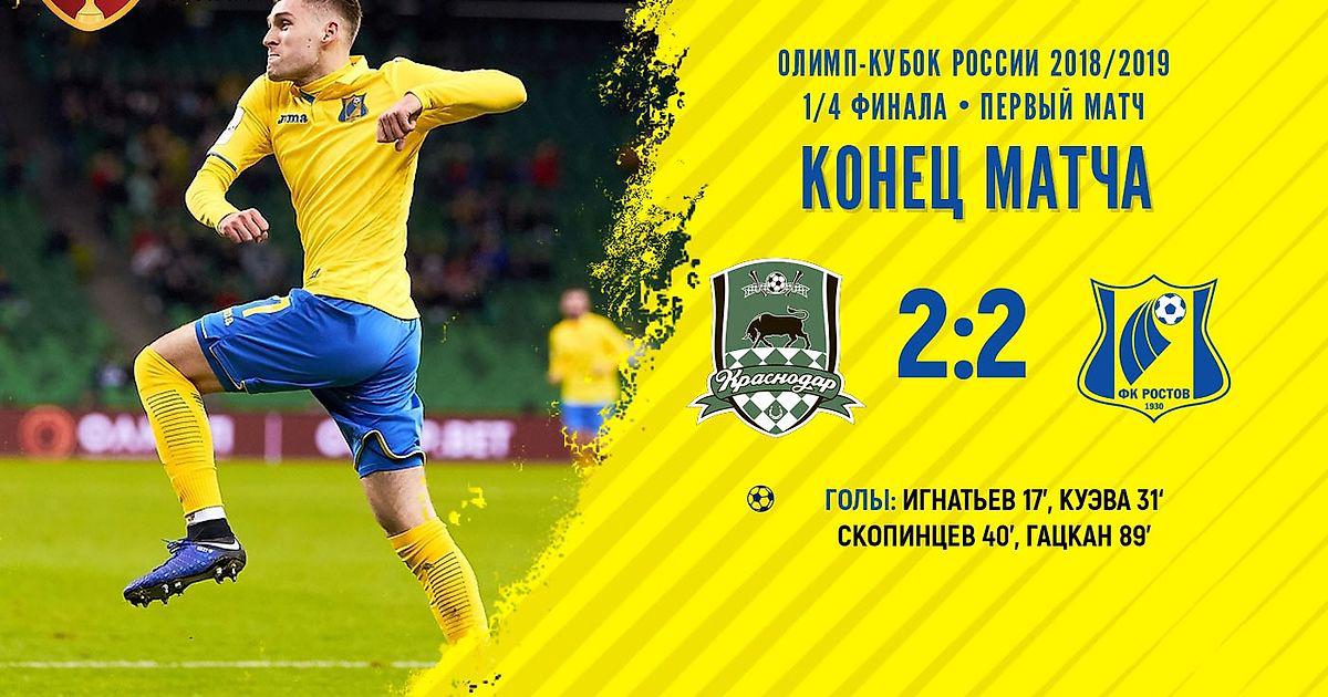 К несчастью для «Ростова» у команды возникали проблемы в опорной зоне и зоне подборов. «Краснодар» вынудил ростовчан обороняться низким блоком, после чего достаточно быстро воспользовался предоставленным шансом. Вначале краснодарцы открыли счет. Вроде бы уходивший в аут отскок забрал Классон, который тут же прострелил в центр штрафной, где набегавший Игнатьев отправил мяч в сетку. Спустя еще 15 минут давления привел к фолу возле штрафной в исполнении Салетроса. К мячу подошел Куэва и прямым ударом вонзил его в верхний угол ворот Песьякова – 2:0.