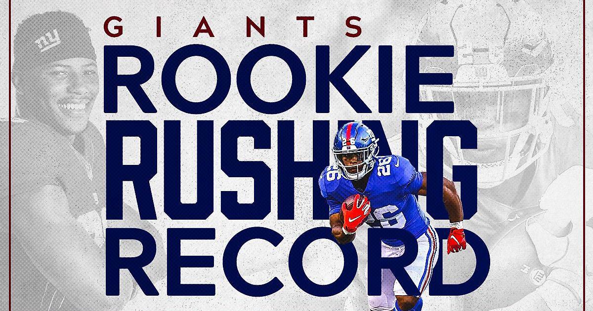 Прежде всего, отметим, что Баркли поднялся на первое место в клубной истории по числу ярдов на выносе, набранных бегущим в его первый сезон в НФЛ, — сейчас в активе у Сакуона 1124 ярда, в то время как у Альфонсо «Таффи» Лиманса, идущего вторым в истории «Джайентс» по этому показателю, 830 ярдов на выносе в статусе новичка.