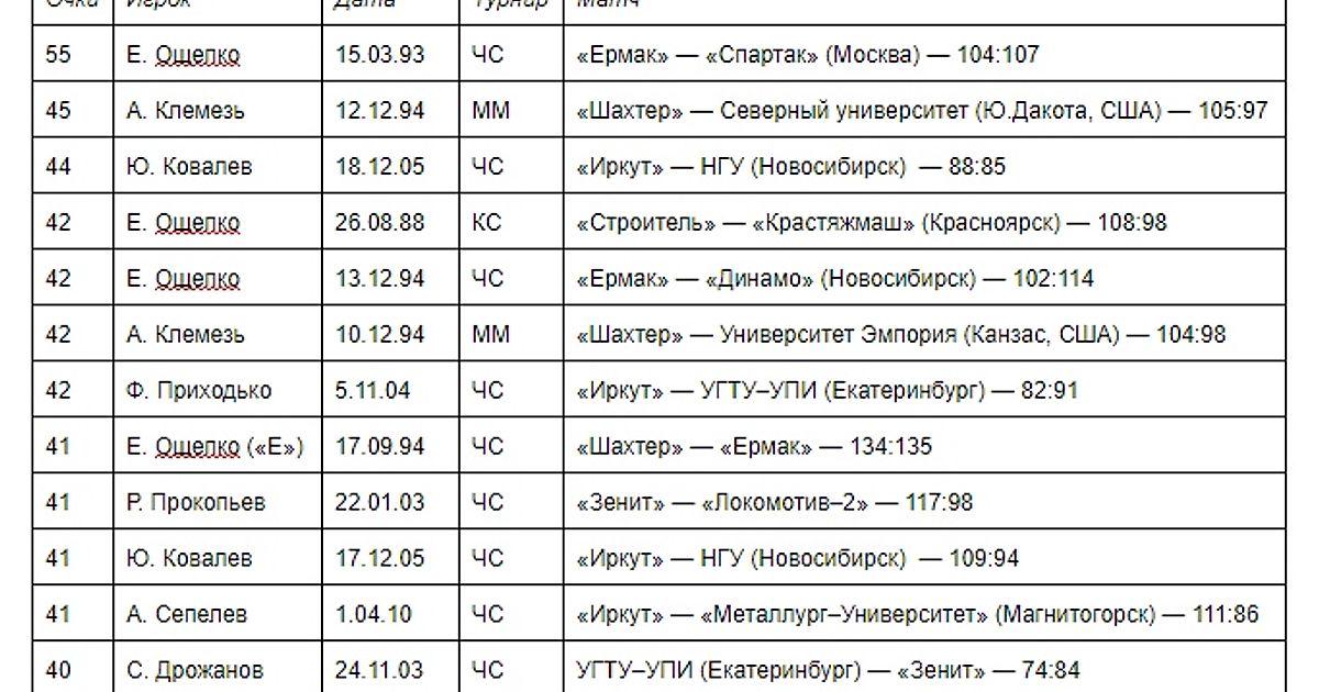 2. Техническая статистика (дабл–даблы, трипд–даблы, реализация штрафных, подборы, блокшоты, голевые передачи, перехваты) в России ведется с 1994 года.