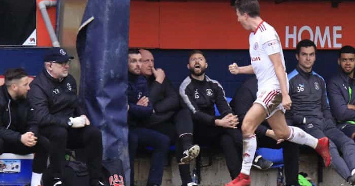 На фотографии футболист «Аккрингтон Стэнли» Шон МакКонвилл издевается над скамейкой «Лутона», после гола в наши ворота в матче прошлого сезона, когда 10 марта 2018 года «Стэнли» на Кенилворт Роуд обыграл «Лутон Таун» со счетом 1:2 (кстати, это поражение пока так и остается последним для «Лутона» на своем поле). В итоге они заняли 1 место в Лиге Два, а мы - второе. Наверное, тогда они думали, что сильнее нас..