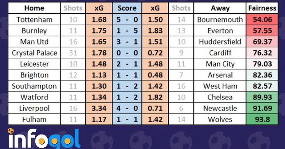 Самым несправедливым (с точки зрения модели xG) результатом стала домашняя победа "Тоттенхэма" над "Борнмутом" со счётом 5-0.