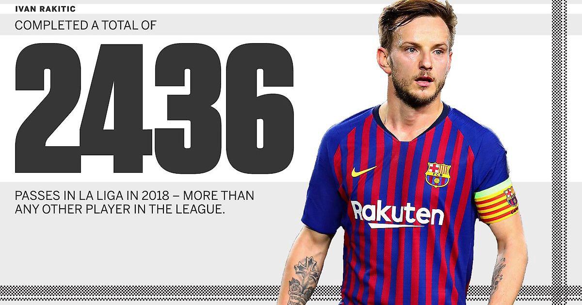 Хорватский полузащитник "Барсы" Иван Ракитич стал самым пасующим игроком Ла Лиги в 2018 году. Он выполнил 2676 передач, 2436 из которых стали точными. Что соответствует 91 проценту точности передач.