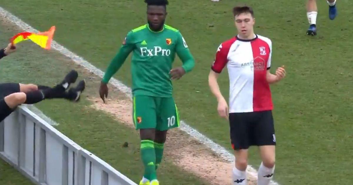 Вингер «Уотфорда» Айзек Саксесс (успех с английского, прим. Sports.ru) боролся за мяч с игроком «Уокинга» на фланге, толкнул бокового судью, прошел с невозмутимым видом дальше, а рефери улетел за щиты. Симуляция или просто не ожидал толчка?