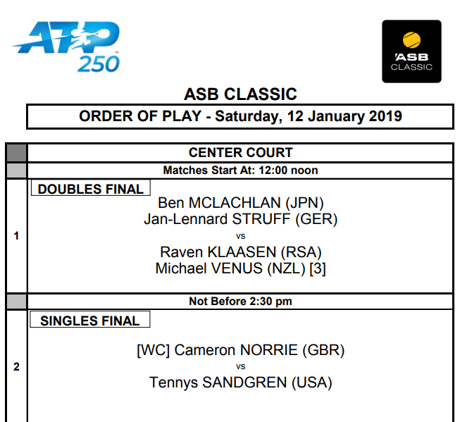 Окленд. Расписание на 12 января и обновленная Main Draw
