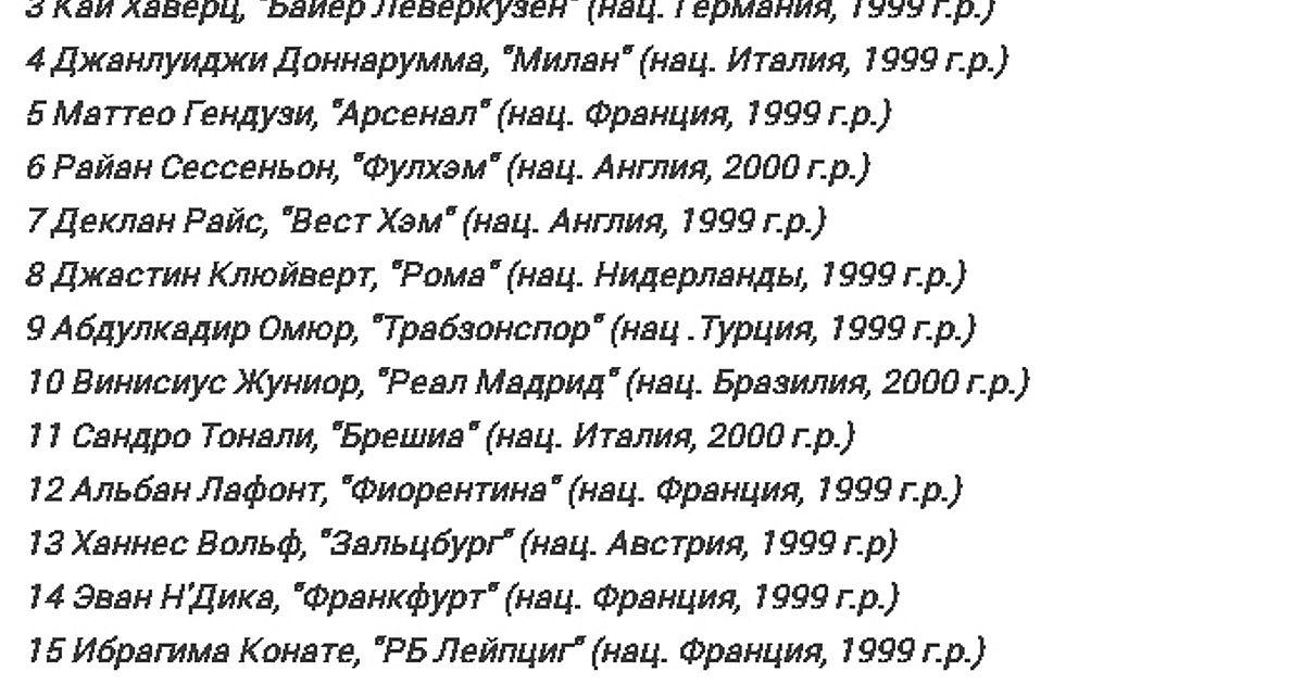 Авторитетное голландское футбольное издание Voetbal International составило список из 20 самых перспективных молодых футболистов играющих в Европе. Список включает игроков в возрасте до 19 лет.
