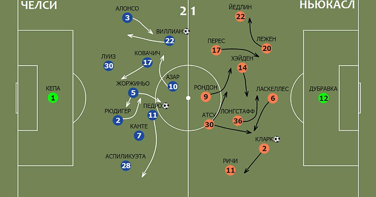 Высокие позиции Аспиликуэты и Алонсо заставили фулбеков гостей играть шире. Так «Челси» создал ситуацию 3v3 в центре, и умное включение Педро вместе с культурой паса Луиза дали результат.