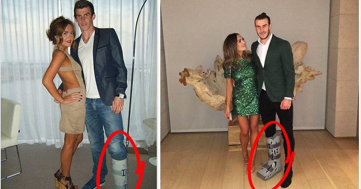 Гарет на обеих фотография запечатлен со своей женой, и на обеих у него на ноге гипс. Только на ранней фотографии гипс на левой ноге, а на поздней — на правой.