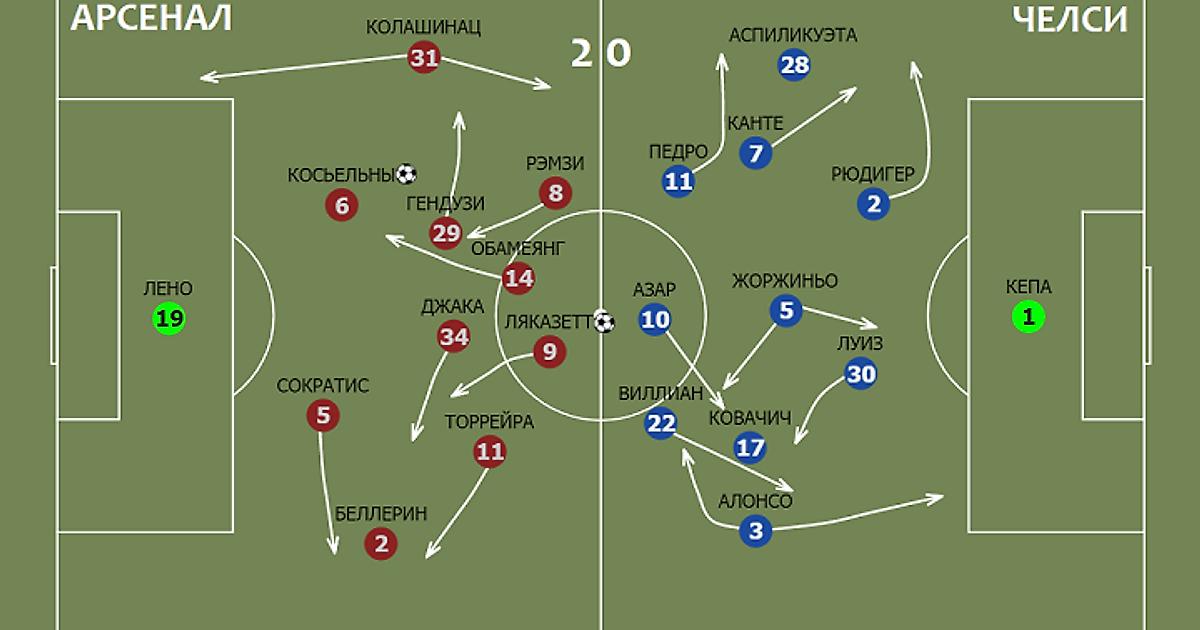 В свою очередь, грамотное позиционирование Джаки в сочетании с тактикой мелкого фола (6 нарушений с момента гола Ляказетта, 4 из которых – вблизи центральной оси) не давали «Челси» вскрыть пространство в центре.