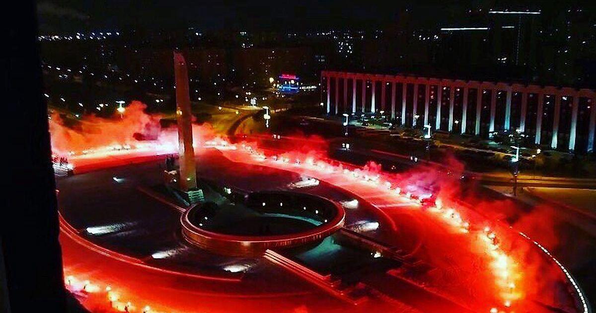 К годовщине этой даты фанаты устроили перфоманс с пиротехникой рядом с обелиском «Городу Герою Ленинграду» на площади Восстания.