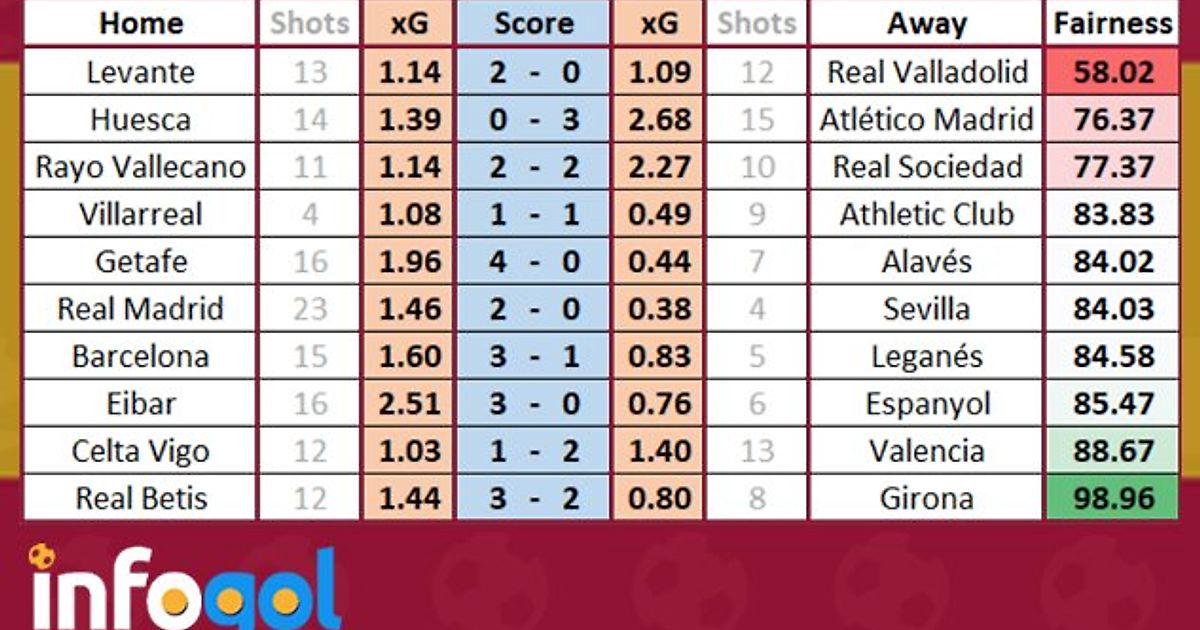 Оценка справедливости результатов 20-го тура Ла лиги от Infogol
