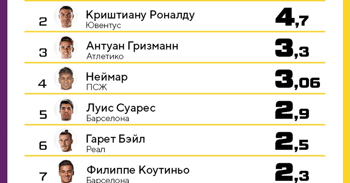 10 самых высокооплачиваемых футболистов из 5 главных лиг Европы: