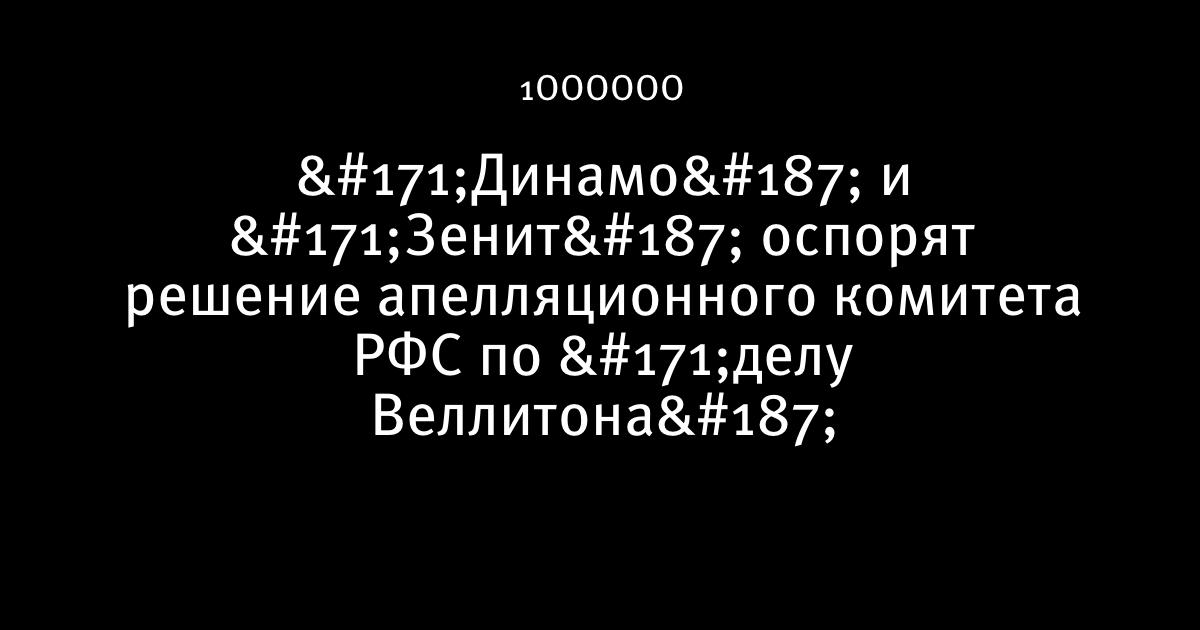 "Динамо" и "Зенит" оспорят решение апелляционного комитета РФС о сокращении срока дисквалификации Веллитона с шести до трех игр. "Армейцы оспаривать наше решение не будут, у них есть дела по-важнее, чем Веллитон. Это Лига Чемпионов. А вот их коллеги из "Динамо" и "Зенита" готовы бороться за справедливость", - сообщает источник из подвального помещения РФС.
