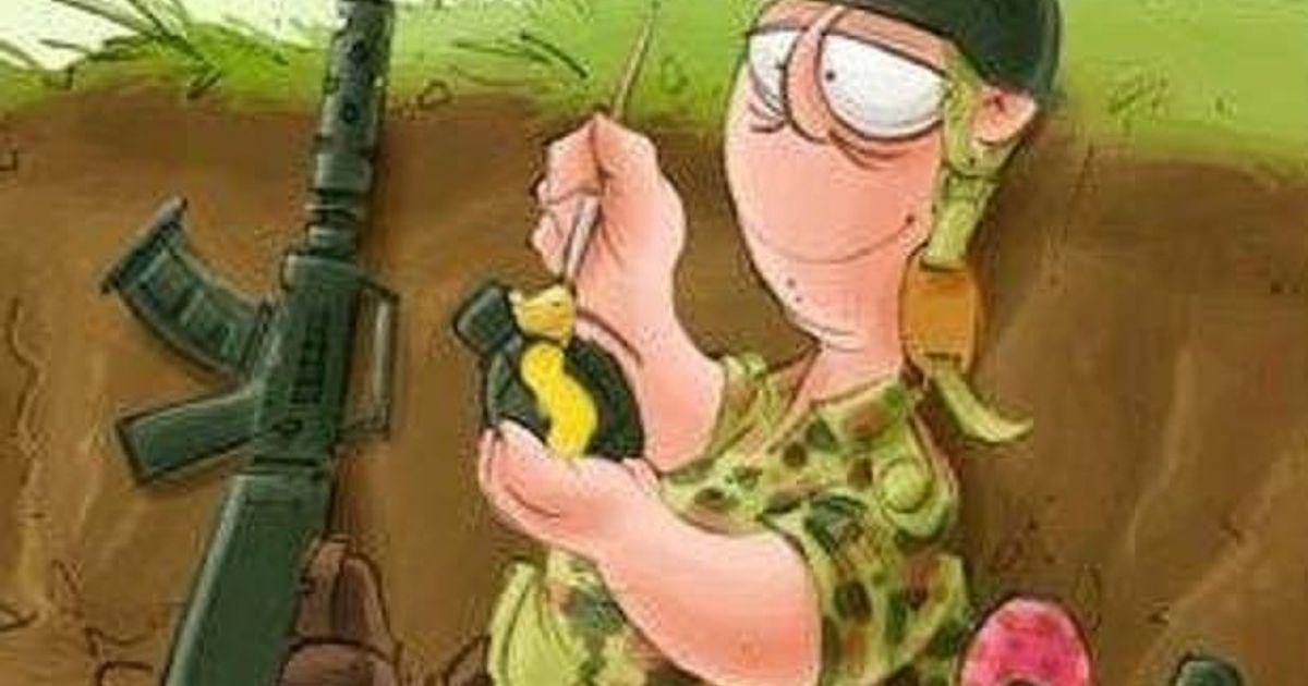 Все было быстро, весело и предельно позитивно, пока на огневой рубеж не выдвинулся косорукий сын великого литовского народа, рядовой Щ. Тихий, маленький интеллигентный мальчик, форма на котором сидела, как фрак и цилиндр на деде Щукаре - то есть предельно нелепо. Взяв гранатку в свою маленькую ручку, поправив круглые очочки прекрасный рядовой Щ. зажмурил глаза и швырнул ее размашистым движением Давида, разящего пращей тупого дылду Голиафа.