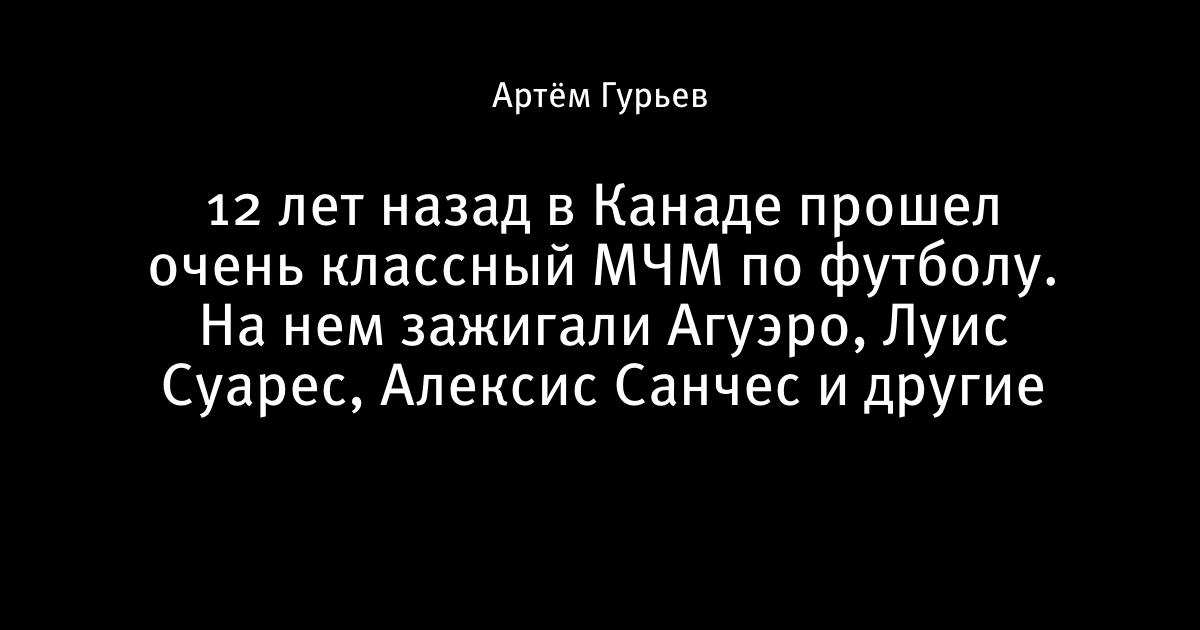 12 лет назад в Канаде прошел очень классный МЧМ по футболу. На нем зажигали Агуэро, Луис Суарес, Алексис Санчес и другие