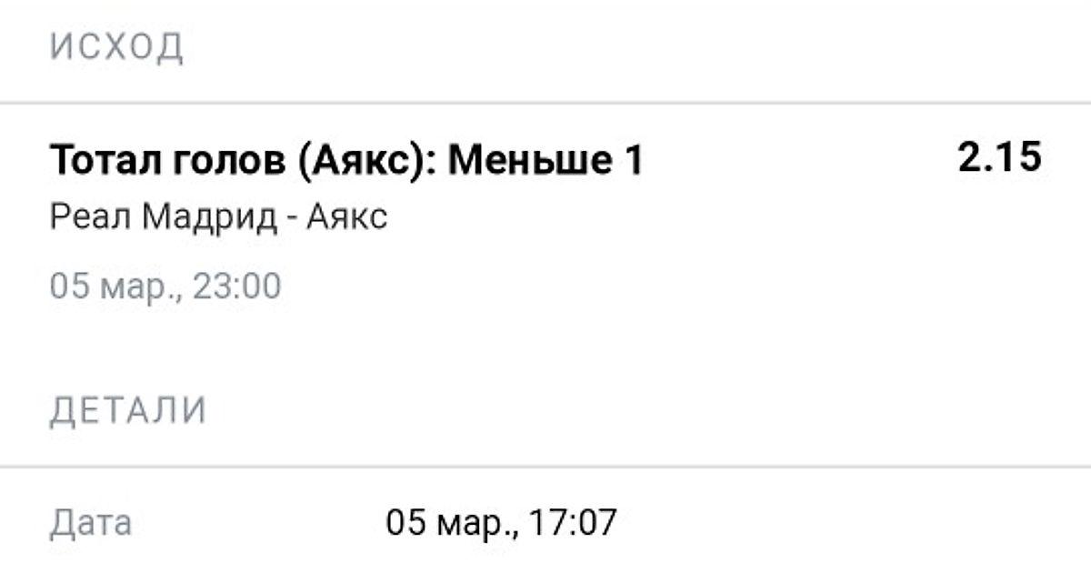 В итоге возьму Аякс ТМ 1 за 2,15, чисто математически Реал не может пропускать 8 матчей подряд, и 4 матч дома.