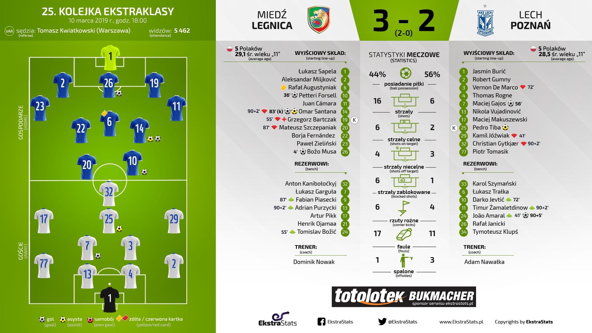 «Лех» после двух побед отправился к дебютанту Экстракласы в Легницу. Хозяева не проявили должной гостеприимности и уже на 4-ой минуте открыли счет. Форселл пробил со штрафного с отскоком от газона, что доставило серьезные проблемы Буричу. Босниец отбил мяч перед собой, а Муса головой добил снаряд в сетку ворот. Несмотря на необходимость отыгрываться и преимущество в классе футболистов, познаньцы не собирались атаковать. Инициативой продолжали владеть хозяева. Форселл снова начал примеряться к воротам Бурича. И если его удар на 25-ой минуте не стал голевым, то выстрел с метров 30-35 десятью минутами позже был уже куда опаснее, Бурич не сумел спасти познаньцев. Перед самым перерывом гости сумели наконец-то ответить своей атакой на голевые удары легничан, но Де Марко пробил рядом со стойкой. Второй тайм уже начался с атак «железнодорожников», которым нужно было спасать игру. За дело принялся лучший бомбардир «Леха» Гиткер, в дело шли стандарты, но результата это не приносило. Но на 56-ой минуте гости все-таки сократили отставание в счете. Педро Тиба прострелил вдоль ворот, а Гайос с нескольких метров поразил ворота Сапелы. Познаньцы продолжали атаковать. Неплохой момент после углового был у Рогне, но Агустыняк успел помешать норвежцу пробить. Казалось, что «Лех» вот-вот забьет и сравняет счет. Но один из стандартов «Медзи» закончился игрой рукой в исполнении Вуядиновича. Нарушение было очевидным, и арбитр назначил пенальти. Камара пробил под перекладину и не оставил шансов Буричу, чтобы отбить мяч. Уже в добавленное время познаньцы вновь сократили отставание до минимума усилиями Амарала. Здесь, кстати, не обошлось без ошибки голкипера хозяев Сапелы. Но двух оставшихся минут не хватило «железнодорожникам», чтобы сравнять счет. «Лех» возвращается домой без очков и пока познаньцы не выглядят серьезными претендентами на медали, в Легнице же эти три очка важны как никогда, команда отдаляется от зоны вылета и готовится к кубковому матчу в хорошем настроении.