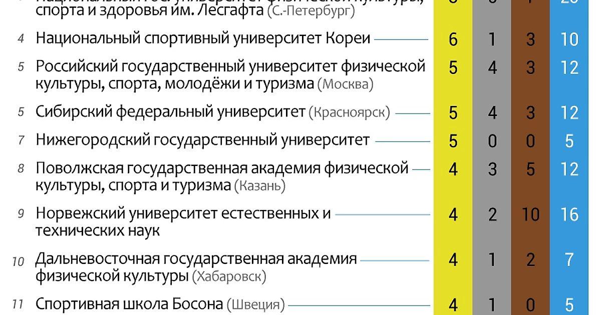 Благодаря победе хоккейной сборной России первое место заняла Смоленская академия физической культуры, спорта и туризма. На втором месте финский Университет Лапландии, из которого были члены команды «Team Unique» по синхронному катанию на коньках. Тройку замкнул петербургский физкультурный университет имени Лесгафта.