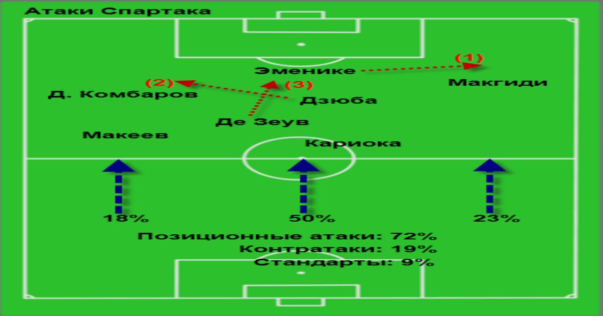 В первом тайме в атаках красно-белых соблюдался баланс между правым флангом и центром. И только после ухода Макгиди бровка стала включаться менее активно. И в этом нет вины Ари, сменившего ирландца, – просто бразилец исполнял несколько другие функции в игре и больше смещался в центральную зону. Помимо него, к атакам по центру активно подключался и Де Зеув (3), который работал по всему полю, в отличие от своего напарника по средней линии Кариоки, больше сосредоточенного на разрушительных функциях.