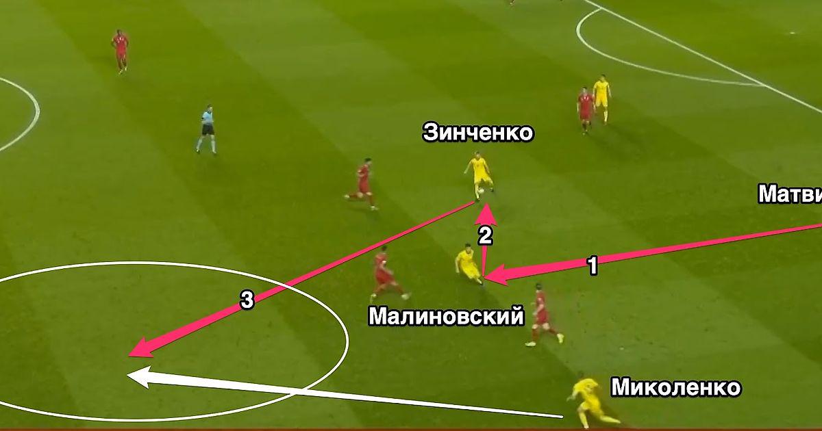 Украина около 5 раз проводила очень похожие между собой комбинации, основанные на том, что все это время наигрывает Шевченко: хорошее движения мяча, мобильность полузащитников, быстрый перевод вектора атаки. Суть сводилась к тому, что основная часть футболистов стягивалась к правому флангу, а дальше шла серия передач, нацеленная на доставку мяча в освободившуюся зону на противоположном фланге. Здесь Украине очень помогал стиль прессинга Фернанду Сантуша, который отправляет всех своих игроков зажимать соперника у бровки, оголяя другую. И здесь мы еще раз хвалим Миколенко и его продуктивность в этом матче: именно его рывок являлся завершающим этапом этих комбинаций и без его энергии это было бы невозможно.