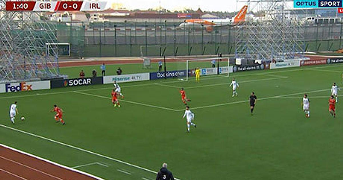 В трансляцию матча сборных Гибралтара и Ирландии попал завораживающий момент: прямо за воротами стадиона по взлетной полосе проехал самолет.