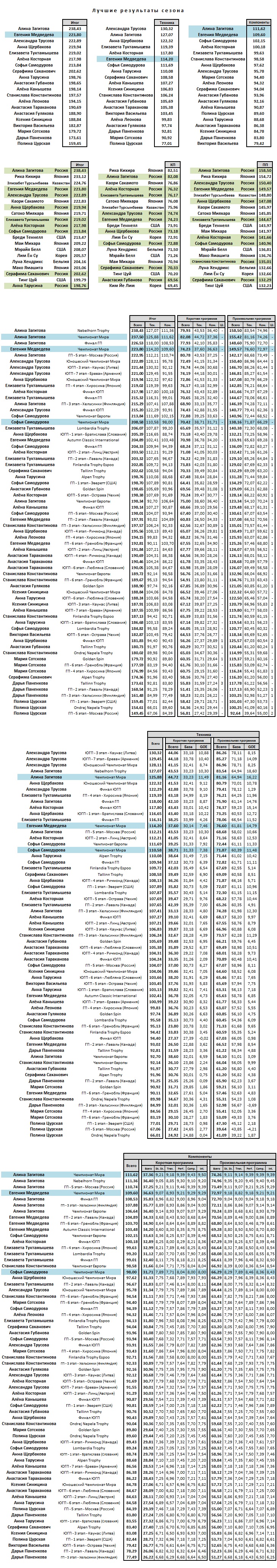 Наконец-то Ваши таблицы,Спасибо.Очень удобно будет оппонировать.Вот сразу видно из чего же состоит оценка ЕМ ,на половину из компонентов ,разница в 4,6 балла ,между техникой и компонентами ,у АЗ разница в 14,26 балла .А пишут одинаково накомпоновали их.Если бы одинаково у Алины был бы мировой рекорд,но без переизбытка компонентов ЕМ ,заняла бы положенное место в турнирной таблице.Вот и нашлись все компоненты .