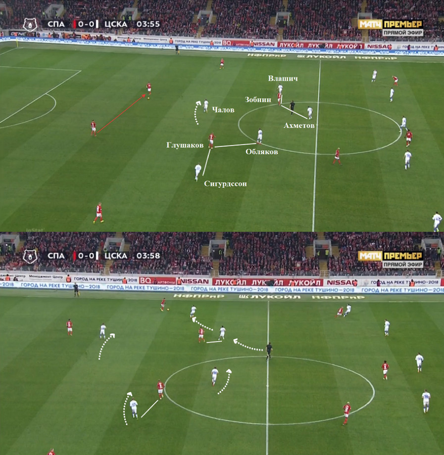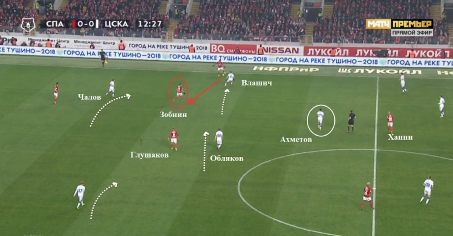 В первом тайме подобный прессинг «армейцев» зачастую проваливался. Например, несколько раз передачи на смещавшегося чуть глубже Зобнина разбивали прессингующий пятиугольник Гончаренко – Чалову не удавалось перекрывать линию передач (и вряд ли он теоретически мог), Влашич грамотно переключался на крайнего защитника, а вот Ахметов не понимал, контролировать ли ему возможную передачу между линий на Ханни или поджимать Романа. При глубокой обороне Ильзат часто опускался чуть ниже, чем его партнеры по линии обороны, чтобы контролировать потенциальный пас на Ханни между линий, поэтому в ситуациях с фланговыми ловушками ему было не так просто принять решения.