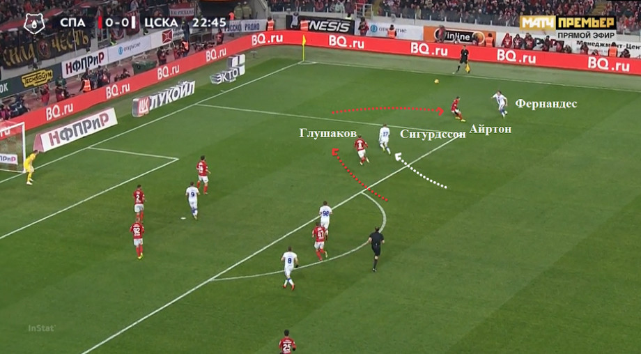 Поэтому ЦСКА в первом тайме получал мяч в чужой трети и упирался в массивный оборонительный блок «Спартака». По включениям инсайдов (Сигурдссона и Влашича) из глубины часто работали опорники «Спартака», не отпуская их, а на Фернандеса вовремя выходил Айртон.