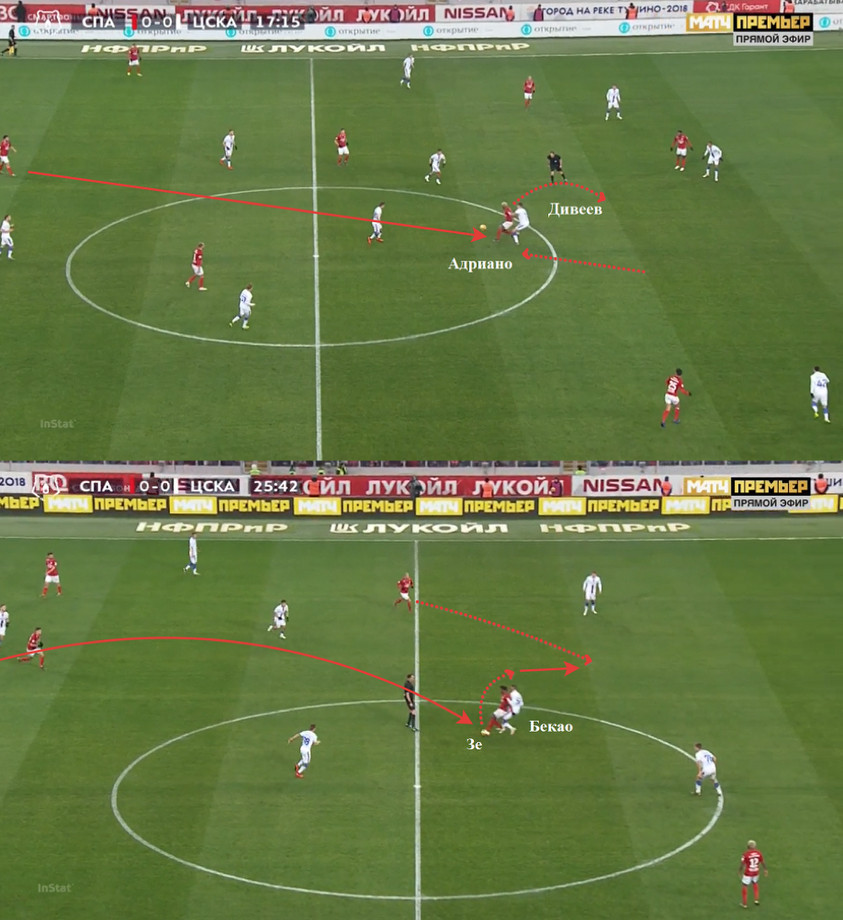 ЦСКА чаще бил по воротам, но его атака смотрелась скудно«Спартак» предпочел прессинговать в своих 4-4-2 довольно стандартно: ближнего к мячу опорника ЦСКА прессинговал центральный полузащитник, дальнего контролировал вингер, а еще один полузащитник контролировал пространство между линий.
