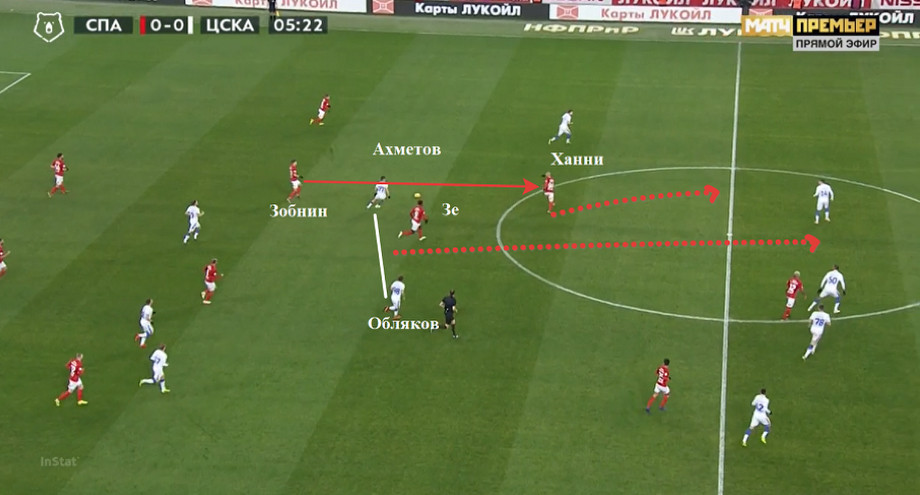 «Спартак» несколько раз опасно вскрывал полузащиту ЦСКА в переходных фазах: в эпизоде ниже, например, ЦСКА потерял мяч на чужой половине и не успел перестроиться, а Зобнин отрезал опорников одной передачей на Ханни, начав опасную контратаку.