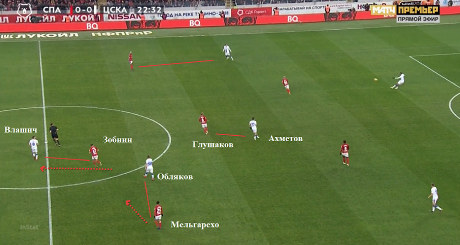 Разрывы между линиями ЦСКАПричина, по которой «Спартак» смотрелся сильнее в первом тайме. Ахметов и Обляков– гибкая, но очень рискованная пара полузащитников в матче против команды, у которой вся линия нападения чувствует себя довольно комфортно между линий.