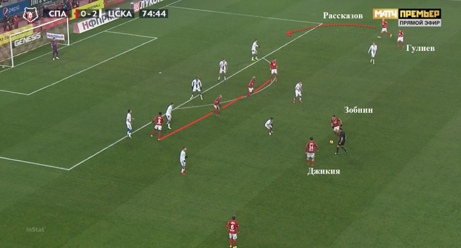 Где-то за 20 минут до окончания матча «Спартак» старался просто перегружать линию обороны ЦСКА, создавая 5-в-5. Очень высоко поднимались центральные защитники хозяев (особенно Джикия), а Зобнин и Гулиев поочередно подключались через полуфланги или даже фланги.