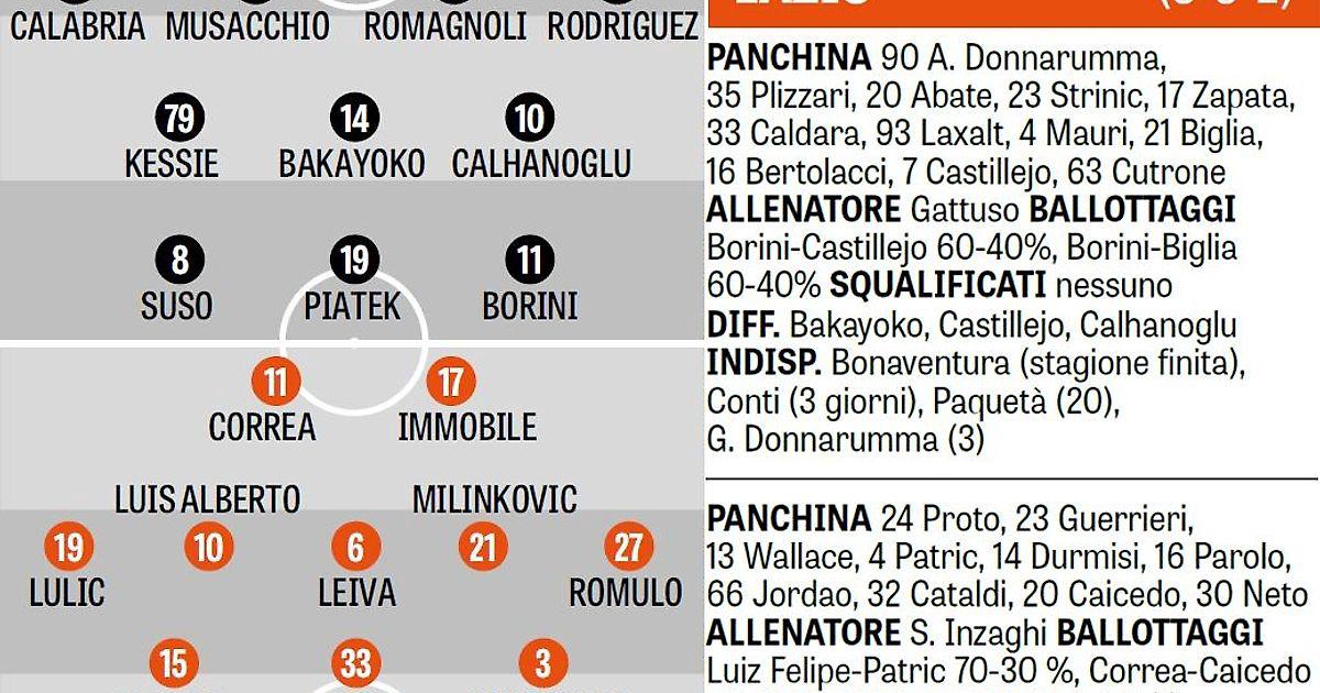 Вероятные стартовые составы команд в субботнем матче «Милан» - «Лацио» по мнению La Gazzetta dello Sport