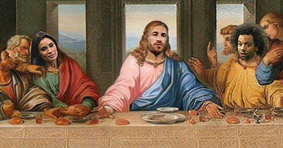 Там висит реплика росписи Леонардо да Винчи «Тайная вечеря», на которой на месте Иисуса Христа изображен сам Рамос! На картине также изображены невеста Рамоса Пилар Рубио и Марсело – они в роли апостолов.