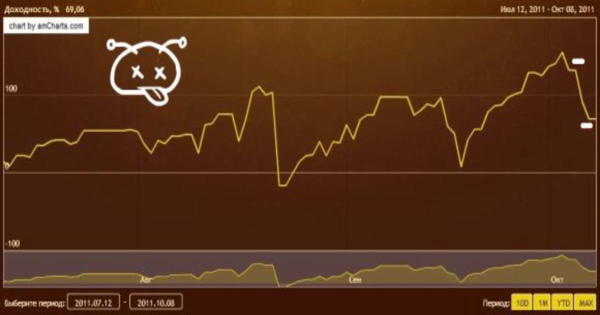 Как я уже писал ранее, при инвестировании в этот счет я рассчитывал на долгосрочную перспективу. На графике доходности уже были две просадки, так что следующую можно было ожидать. И несмотря на то, что 22 августа счет даже ушел в -16.24%, уже к 3 октября доходность составила 154.8%. Так что даже инвестировав при создании счета можно было бы получить порядка 50% дохода в месяц.