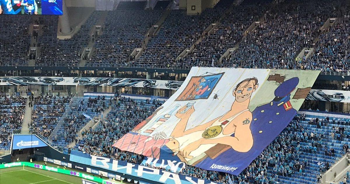Болельщики «Зенита» вывесили гигантский баннер на домашнем матче с «Динамо». На плакате изображен пьяный полицейский с медалью «За Кокорина» и эмблемой «Динамо» на плече.