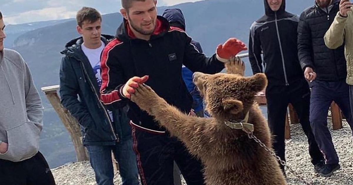 Хабиб Нурмагомедов провел небольшой спарринг с медведем. Все закончилось мирно – в конце боец покормил животное.