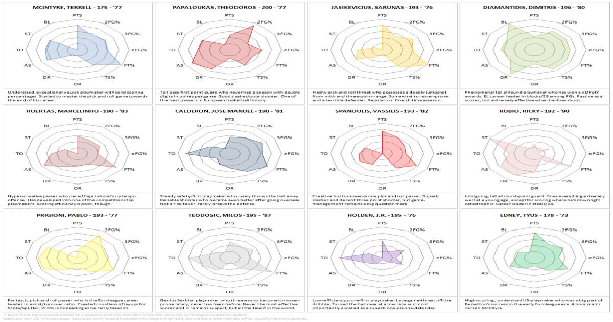 IN THE GAME сделали простой и наглядный, как бы его назвать... графический рейтинг игроков Евролиги, основанный на статистике. С одной стороны, в основе лежат вполне конкретные показатели - очки, подборы etc. С другой - не указывается, что "игрок А ровно на три пункта круче игрока Б". Это просто микс из разных статистических показателей. Можно, конечно, просто посмотреть таблицы и посчитать PER, но таблицы скучны, а PER, подобно рейтингу в симуляторах, слишком уж категорично расставляет всех по местам. А рисунки интереснее, нагляднее и не дают однозначных ответов. Скорее, пищу для размышлений.