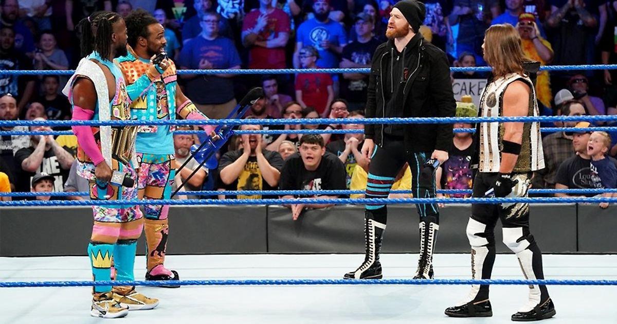 С самого начала шоу мы могли наблюдать последствия «Wild Card Rule», которое ввёл Винс МакМэн на прошлом RAW. А именно: ЭйДжей Стайлз, претендент на чемпионство Вселенной, открыл данный выпуск. Своё появление он обосновал именно этим правилом, добавив, что SmackDown Live всё также остаётся домом, который он построил. За ним на ринг последовал второй представитель ростера RAW – Сэми Зейн. Underdog from the Underground сказал, что ему здесь совершенно не нравится, однако он решил занять данное место, чтобы кто-либо иной не вышел и не потешил эго ЭйДжея. Стайлз в ответ напомнил, как Брон Строуман выкинул Зейна в мусорный контейнер и посоветовал принять душ. Это сперва позабавило канадца, однако чанты зрителей «Сходи в душ» вывели его из себя, но в этот момент появляются участники Нового Дня. Сразу же чемпион акцентировал своё внимание на Стайлзе, попросив того не напоминать о своём архитектурном вкладе и, хоть тот и любит эту катч-фразу, Феноменальный более не живёт на этом бренде. Сейчас они вместе находятся на ринге, и Кофи хочет знать – что ЭйДжей собирается делать с этим? Зейн прерывает их, заявив, что знает к чему это идёт. Он любит Кофи, но не понимает, почему тот даёт помыкать собой фанатам и раздаёт тайтл-шоты всем подряд. Тем более, что именно сам Зейн заслуживает титул больше всего. Кингстон вновь вспоминает про запах от Сэми и заявляет, что готов сражаться против любого из них, чтобы доказать, что он «сражающийся чемпион».