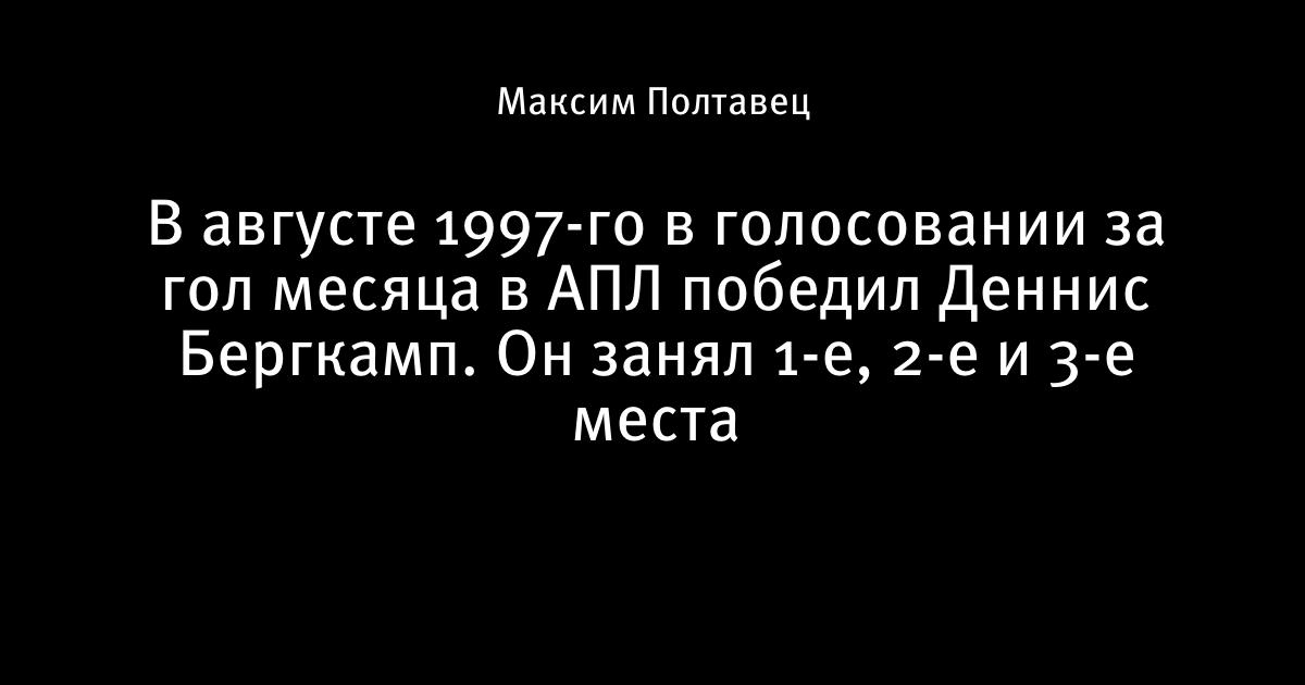 В августе 1997-го в голосовании за гол месяца в АПЛ победил Деннис Бергкамп. Он занял 1-е, 2-е и 3-е места
