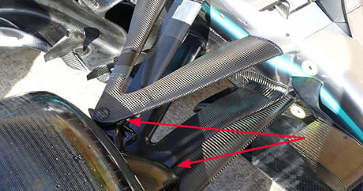 Аэродинамическая концепция «Мерседеса» сильно отличается от остальных машин, и потому даже невооруженному глазу заметно: у болидов Боттаса и Хэмилтона самое серьезное нагромождение деталей за передними колесами.
