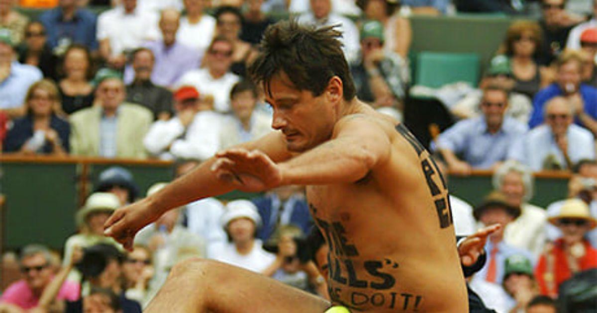 После истории с Джампом нельзя не вспомнить англичанина Марка Робертса. Для него финал «Ролан Гаррос»-2003 стал одним из более чем 400 спортивных событий, во время которых он выбегал на площадку. Фишкой Робертса было то, что он любил красоваться голым, и в Париже появился на корте, надев только три теннисных мяча.