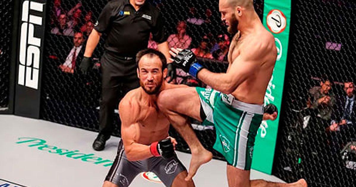 Боец из Дагестана вырубил соперника коленом в прыжке. Это самый быстрый нокаут американского промоушена