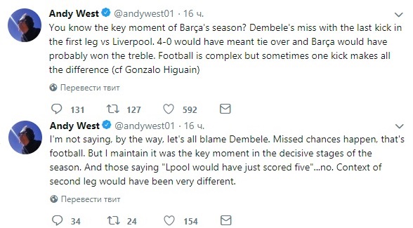 Перевод теории, претендующей в скором времени на Нобелевскую премию звучит так: «Знаете, какой момент был ключевым в сезоне «Барсы»? Промах Дембеле на последнем ударе в первом матче с «Ливерпулем». 4-0 бы означали завершение полуфинала, и «Барса», вероятно, выиграла бы требл. Футбол сложен, но иногда один удар определяет разницу (центрфорвард Гонсало Игуаин)».