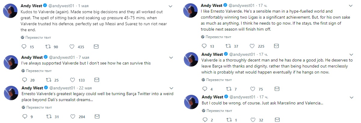 Как правильно отметил в комментариях к последнему представленному твиту пользователь @SweeperWriter, посмотрим в следующем сезоне, сможет ли Вальверде в финале Кубка Испании победить намного более мощную команду. Не факт, что такие в Испании существуют, но ведь для «специалиста» с BBC все победы гигантского клуба, коей является «Барселона», являются целиком и полностью победами Вальверде; победить в Ла Лиге с ФКБ для него, видимо, ничуть не проще, чем взять АПЛ с «Лестером»; а где-то между 3-им реальным и 4-ым виртуальным голами в ворота «Ливерпуля» располагается профессионализм, которого совсем не нашлось у Вальверде и многих футболистов 6 дней спустя.