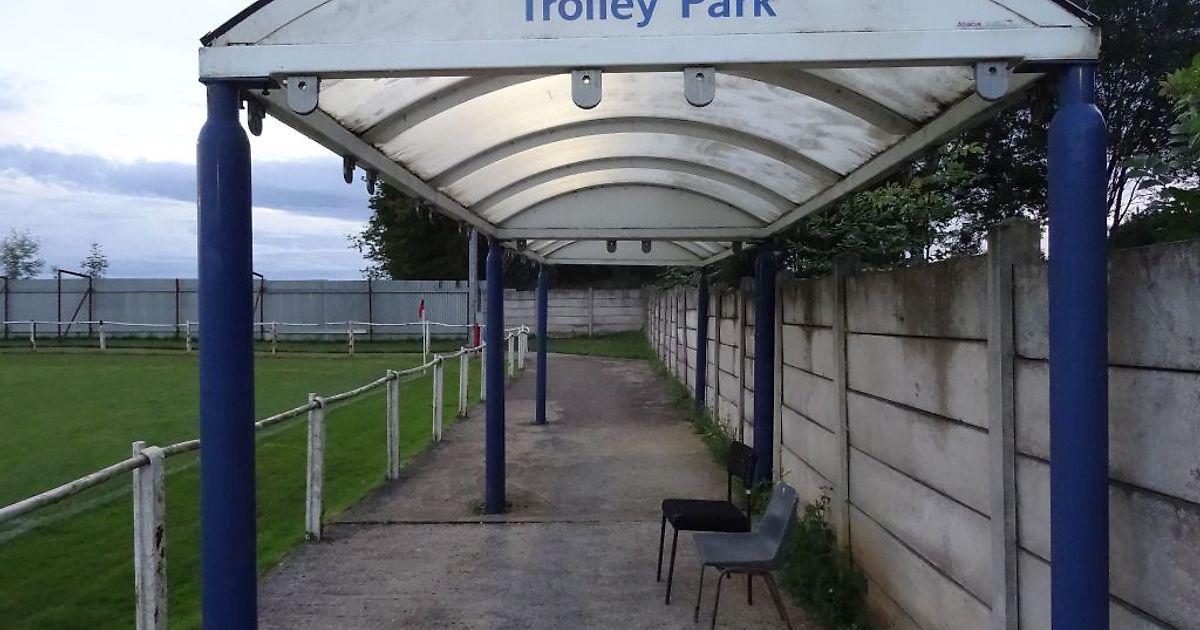 У «Теверсала» – маленький стадиончик. А вот так выглядит на нем гостевая трибуна. Это 2 стоянки для тележек от универмага Tesco.
