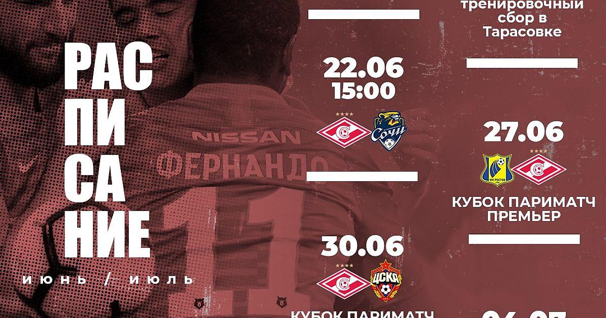 С 16 по 21 июня команда будет тренироваться в Тарасовке, а 22-го в 15:00 проведет товарищеский матч с новичком Российской Премьер-Лиги — ФК «Сочи». Встреча пройдет на тренировочном поле около «Открытие Арены».