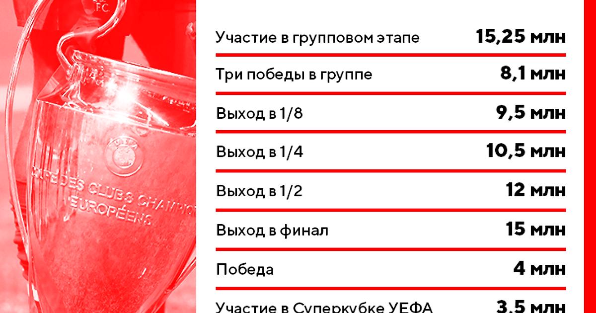 • На групповом этапе «Ливерпуль» заработал 32,85 млн евро (15,25 просто за участие, 8,1 млн за три победы и еще бонус 9,5 млн за выход в 1/8 финала).